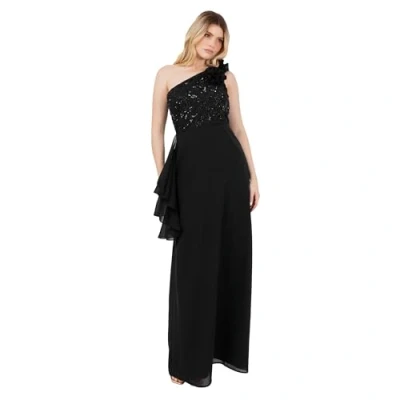 Maya Deluxe Women's Maxi Dress Ladies One Shoulder Necklline Sleeveless Sequin Embellished Rosette A line Evening Prom Ball Gown, Black 16