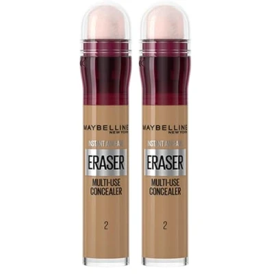 Maybelline Concealer: Multi-purpose liquid concealer for covering dark circles, correcting imperfections, sculpting and illuminating skin, Also suitable for concealing wrinkles Result: Ultra-targeted correction, Natural finish and long-lasting wear, Dark circles and signs of fatigue disappear in an instant. Can be used for highlighting and countouring How to Apply: Apply the product under the eye area on dark circles and crow's feet, When using first time, turn the neck of the applicator 8 times until the formula appears on the applicator. Multiple skin matching shades Formula enriched with goji berry and haloxyl to slow down skin aging, Applicator tip covered with thousands of soft micro-fibres to reach every imperfection Contents: 2x Instant Anti Age Eraser Eye Concealer, Dark Circles and Blemish Concealer, Ultra Blendable, Shade: 02 Nude, Volume: 6.8 ml