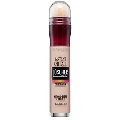 Versatile, liquid concealer for concealing dark circles, wrinkles and other first signs of age on the face, can also be used as a highlighter Results: Awake appearance, Ultra-precise correction of imperfections, Natural complexion and perfect, long-lasting coverage Apply to the wrinkles and dark spots around the eyes, When using for the first time, twist the applicator neck 8 times until the make-up emerges Goji berry and Haloxyl enriched formula to slow skin ageing, Foam tip covered with thousands of soft microfibres to erase any imperfection, Vegan formula, Manufactured according to EU regulations Box contents: 1 x Maybelline New York Instant Anti-Age Effect Concealer, Colour: No.05 Brightener, Contents: 6.8 ml, Made in France