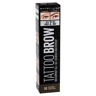 Waterproof eyebrow gel with applicator for easy application and brush to blend formula Long lasting up to 2 days for effortlessly replenished eyebrows Apply the gel in small strokes from the middle of the eyebrow, fill in gaps and precisely tighten the hair, remove excess eyebrow gel from the brush before use Spiral brush for successful application and blending of eyebrow gel, manufactured according to EU regulations Box contents: 1x Maybelline New York tattoo brow waterproof eyebrow gel, incl. applicator and brush, no. 06 deep brown, capacity: 5 ml, made in Canada