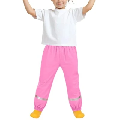 【Waterproof & Protective】Made from durable polyester, these kids waterproof trousers are fully rain and mud resistant while staying lightweight and breathable. A must-have rain trousers kids for school runs and outdoor adventures. 【Elastic Foot Straps】Designed with fixed elastic straps that secure under shoes or boots, these waterproof trousers kids stay in place and won’t ride up, keeping children completely dry even when running, cycling, or jumping in puddles. 【Reflective Safety Design】Featuring reflective strips on the legs, these girls waterproof trousers and boys pants provide extra visibility on rainy, foggy, or dark days, making outdoor play safer and giving parents peace of mind. 【Easy to Wear & Comfortable】The elastic waistband and wide-leg cut allow easy layering over jeans or leggings. No zippers or buttons – simple pull-on style that kids can put on and take off by themselves. 【All-Season Use & Gift Idea】Thin for summer yet roomy enough to wear over trousers in colder seasons. Perfect for school, hiking, camping, seaside fun, and muddy play. Easy to wipe clean or hand wash. A practical gift for birthdays, back-to-school, and holidays for children aged 3–9 years