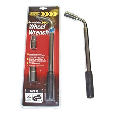 Extendable wheel wrench Complete with two reversible drive sockets - 17mm/19mm and 21/23mm Extends from 355mm to 530mm for extra leverage TUV/GS Approved