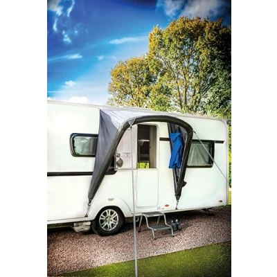 Offers quick & easy protection from the rain coming into the caravan or motorhome Suitable for caravans & motorhomes with an awning rail connection height between 235cm – 290cm All weather 150D Oxford Polyester Quick & easy to inflate - single point inflation air frame Taped seams Includes hooks for coats & accessories Includes storage pockets for accessories 3000mm hydrostatic water resistance Lightweight & compact - 3.3kg Webbing straps, pegs, handpump, carry bag included
