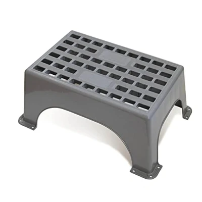 UV stable polypropylene plastic step Large tread area for maximum safety Tread size 445mm x 270mm Grey colour Manufactured according to EN14183:2003 standards Anti-slip tread Strong and stable construction Large feet with peg holes for extra stability when used on grass Maximum load 150Kg Step height 235mm