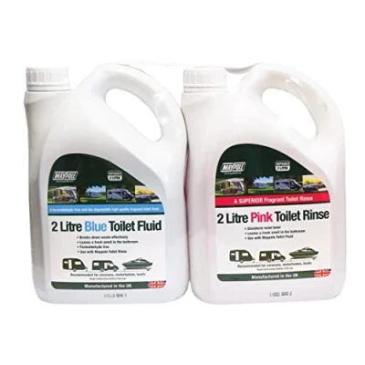 Twin pack contains 2 Liter Superior Toilet Fluid and Rinse, for caravans, motorhomes and portable toilets Blue toilet fluid breaks down waste effectively and the pink toilet rinse disinfects the toilet leaving it clean and free of bacteria Leaves a fresh smell in the bathroom Manufactured in the UK
