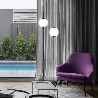The lamp showcases a striking black finish that beautifully complements its metal fittings. It features spherical dome lamps crafted from pristine white glass, creating a balanced aesthetic that elevates the look of any room. The sleek, modern profile of the lamp, combined with its thoughtful design, ensures it is not only a source of light but also a stylish statement piece.