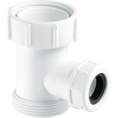 General description The McAlpine V33S-22 is a Tee Piece plumbing fitting designed for versatility in waste water systems. It features a 1½" BSP (British Standard Pipe) nut, a 1½" BSP thread, and a 19/23mm universal connection, making it compatible with a range of pipe sizes. The Tee Piece shape allows for a branch connection to be made off a main pipe or for two pipes to be connected at a right angle. Technical specifications Connection type: 1½" BSP nut Thread size: 1½" BSP Universal connection size: 19/23mm Other information Not suitable for use with high level cisterns as installation into external flush pipe would cause malfunction of the syphonic flushing action.
