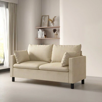 General description The 2 Seater Linen Fabric Loveseat Sofa, known as Laura Beige, is a luxurious and modern couch settee designed for comfort and style. It features a sturdy hardwood frame and is wrapped in soft, breathable linen fabric, available in Grey or Beige. The sofa includes plush seat cushions that are secured with Velcro to prevent movement, along with two extra side cushions for added support. Its innovative design and practical height allow for easy cleaning underneath, making it a perfect centerpiece for any living space. Technical specifications Dimensions: 83 cm (H) x 170 cm (W) x 78 cm (D) Usage Ideal for living rooms, apartments, offices, bedrooms, and waiting rooms. Perfect for relaxing with a book or entertaining guests.
