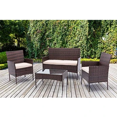 mcc direct 4pcs Rattan outdoor Garden furniture Sofa set with 2x Armchairs 1x Double & 1 table for indoor (Roger) (Brown)