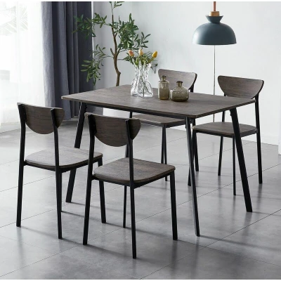 General description Our 5 piece dining set is a beautifully designed ensemble that will enhance the look of your kitchen or dining room. It includes a black metal framed dining table and 4 matching metal dining chairs, all featuring a Medium Density Fibreboard (MDF) wood effect finish. Technical specifications Table dimensions: 112(L) x 62(W) x 75(H) cm Chair dimensions: 41(L) x 42(W) x 78(H) cm Material: Black metal frame with Medium Density Fibreboard table top and chair seat backs Usage This dining set is designed for easy cleaning, making it ideal for families with children. The wipeable surfaces ensure that spills and messes can be quickly managed.