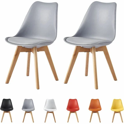 ManoManoGENERAL DESCRIPTION The Eva chairs are versatile, stylish, and perfect for both home and commercial use. These armless chairs feature sturdy wooden legs and a soft cushion pad, making them easy to clean. Crafted from high-quality polypropylene plastic, they complement various interior design themes, whether paired with dark woods or lighter metals. Each chair has a matte finish for added elegance. TECHNICAL SPECIFICATIONS Weight Limit: 120KG Seat Height: 46cm Chair Weight: 3.6KG Overall Dimensions: 56.5cm (L) x 49cm (W) x 82cm (H) FEATURES Durable and stylish for home and commercial use Solid wood legs Protective tips for sensitive flooring Ergonomic shape and curved seat