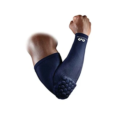 For everyone looking for protection against elbow impact en injuries during sports ==> Features the 9mm McDavid HEX padding made out of closed cell foam hexagons, which do not absorb water and provide an advanced shock absorption. Extended length for better fit as well as added protection against cuts and scratches Ergonomical fit thanks to Hex technology ==> The McDavid HEX technology consists out of small hexagonal foam pieces. These pieces move independent and freely with the body. The 9 mm HEX padding of the 6500 Arm Sleeve does not affect the movement of the arm. Compression stimulates blood flow and increases recovery ==> The compression effect of the McDavid Arm Sleeves prevents lactic acid from accumulating in your muscle, preventing pain and cramping. In addition, the muscles benefit from the increased blood flow, which makes you recover faster from your workout. Comfort fit and super leightweight ==> The fabric of the McDavid Arm Sleeve consists hDc-moisture management technology that keeps the skin cool and dry. This product is made with needle flat seam that feels nice and reduces possible irritation. Not made for sliding ==> The product is made out of nylon and spandex that feels comfortable. If these Arm Sleeves are used to slide like for example in sports like volleyball it will get damaged. This product is made for impact only.