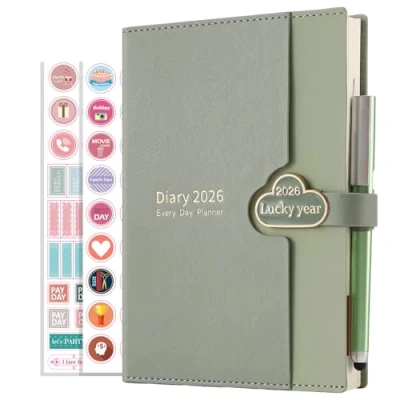 Academic Diary 2026 Day per Page- 12Month Jan 2026-Dec 2026,monday to friday is one page a day (weekend on one page), hourly schedules( 7: 00 a.m. to 20: 00 p.m.For Accurate planning,the diary A5 Includes all you need to plan and keep a note of all your appointments, finances, weight,months view etc and each day separate with lots of space to write,The agenda hardcover productivity daily planner with 8.3x5.9 inchesis a suitable size for your bag, so easy to carry it to work, study or travel. Practical functions - | Personal Data | 2026 2027 calendar | year planner 2026 | Health| |Account |Payment List |Address List |Graph Grid Paper | Coloured Monthly Tabs12 Monthly Planner with to do | metal clasp closured |Inner Pocket |Pen &Pen Holder |3Bookmarkss | 80Gsm ivory Premium paper|8.3 x 5.9 inches| Unique Cloud Design: 12-month academic planner spanning ful page year 2026, including monthly overview calendars and daily reflection sections,26 appointment planner idea for critical tasks, study plans, travel itineraries, health goals, and financial planning for holistic life organisatio.Gift for Women men Premium Design - Premium leather-look cover with secure metal clasp closure, offering both style and durability. the premium 80GSM acid-free ivory thick paper, reduce ink bleed,makes it silky smooth to write on bringing you the ultimate writing experience, diary planner organiser 2026 for Office, Personal and Home -Daily. Great Time Management Planner-Plan your day with ease using the day-per-page layout and glance through the year with monthly views ,it has large spaces to write schedule, so you can stick down notes, ideas, meetings, appointments, Planning,etc. if you're a first timer, a pro,a procrastinator, You'll get more work done than ever before,maximise your productivity.