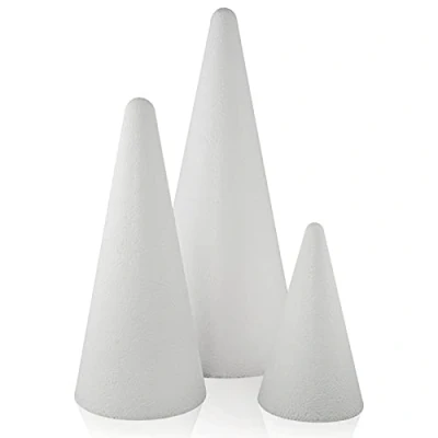 Styrofoam cone for crafting and decorating Size: 1 x diameter 7 cm, height 12 cm, 1 x diameter 9 cm, height 21 cm, 1 x diameter 12 cm, height 27 cm Contents: 3 pieces Material: polystyrene Colour: white