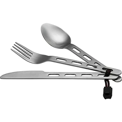 Camping 3-piece cutlery Stainless steel 1 fork, 1 spoon and 1 knife Space-saving flat profile and lightened handles Includes lanyard to keep set organized