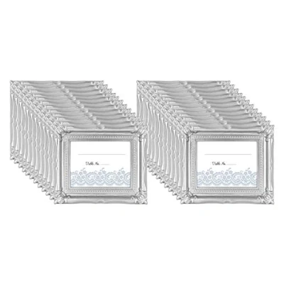 Frames come in a 24-pack - Perfect for place cards, table numbers, and favors. Frames include pre-attached easel for vertical or horizontal display Frames are made of durable plastic with glass front Each frame holds one 2"x2. 75" place card or photograph Frames come packed in a giftable box.Frames have a silver finish