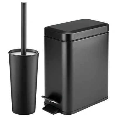 STYLISH SET: Includes 1 toilet bowl brush with an individual holder to store the brush after use; It tucks nicely into the corner or next to a sink or toilet in your bathroom, it is perfect for smaller spaces, half baths, and guest bathrooms; 1 rectangle, step-on trash can wastebasket that is perfect for bathrooms, but can also be used throughout the home - place it wherever you need a small waste can; Includes 1 wastebasket and 1 bowl brush FUNCTIONAL STORAGE: The sturdy-bristled bowl brush deep cleans hard to reach places for a sparkling bathroom; The handle fits nicely in the hand and the round disc shields hands from splashes; The brush sits inside the holder when not in use, which is perfect if you can't store it inside a cabinet or closet; The compact can fits in under sink cabinets COMPACT DESIGNS: Space-saving designs fit into tight bathroom areas, making it easy to tuck these accessories away when needed; The rectangle can is the perfect size for inside cabinets, under counters, sinks, inside base cabinets, cupboards, and other small spaces; The clean modern styling works with any decor; Perfect for half and full baths, guest bathrooms, powder rooms, and smaller spaces where storage is limited; Use in house, apartment, condo, college dorm rooms, cabins, RVs and campers QUALITY CONSTRUCTION: Made of strong stainless steel with a durable finish; The lid and interior bucket liner is made of shatter-resistant plastic; EASY CARE: Clean with mild soap and water THOUGHTFULLY SIZED: Trash Can Measures 11.02" x 5.51" x 11.81" high; Holds 1.3 Gallons/5 Liter Capacity; Bowl Brush Measures 4.5" diameter x 17" high, Weight: 3.1526103466 Pounds, Manufacturer: MetroDecor