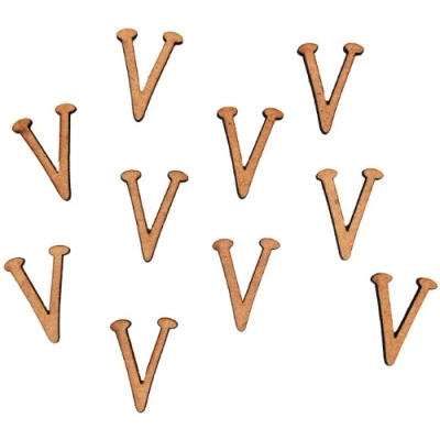 AmazonPack of MDF letter v Pack includes 10 x letter v 2.5cm L x 1.8cm W x 0.2cm D Supplied plain ready to paint / decorate with acrylics poster paints stamps napkins glitters embellishments decoupage / Decopatch etc. Part of a range of wooden shapes