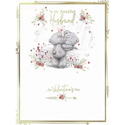 VALENTINE'S CARD FOR YOUR AMAZING HUSBAND - this gorgeous card is richly decorated with gold foil detail and features Tatty Teddy bears sharing a tender hug across a log LOVING WORDS - the front cover message reads 'To my amazing husband on Valentine's Day'. The inside message reads: 'No-one in the world could mean as much as you, you're everything i'll ever need, you've made my dreams come true. With love on Valentine's day' LUXURY FOILED CARD MEASURES 12 X 9 INCHES (30 X 22 CMS) - with its adorable illustrations and opulent gold accents, this lovely Tatty Teddy card is sure to be treasured by your loving husband this Valentine's Day HAND FINISHED FOR PREMIUM QUALITY - made from highest quality materials, with love and care, to help mark a special Valentine's Day together GENUINE ME TO YOU GREETING CARD - unique and instantly recognisable with grey fur, a cute blue nose and patches, Tatty Teddy has captured millions of hearts all over the world with a timeless message of love, happiness and friendship