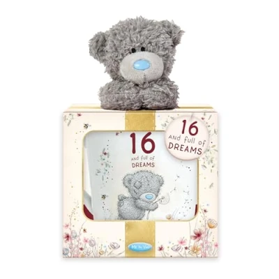 CUTE TATTY TEDDY GIFT SET FOR 16TH BIRTHDAY - give two gifts in one with this lovely set designed especially to celebrate a sweet sixteen-year-old! PREMIUM QUALITY CERAMIC MUG - the mug is illustrated with an adorable image of Tatty Teddy in a pretty cottage garden, along with the caption '16 and full of dreams' PLUSH BEAR SITS 13cm HIGH - Tatty Teddy is looking super cute peeking out of the mug ready for a cuddle; both gifts are packaged in an illustrated presentation box MADE WITH LOVE AND CARE - every Me to You gift is designed in the UK and made from top quality materials - perfect for someone special as they celebrate a milestone birthday GENUINE ME TO YOU GIFT – unique and instantly recognisable with grey fur, a cute blue nose and patches, Tatty Teddy has captured millions of hearts all over the world with a timeless message of love, happiness and friendship