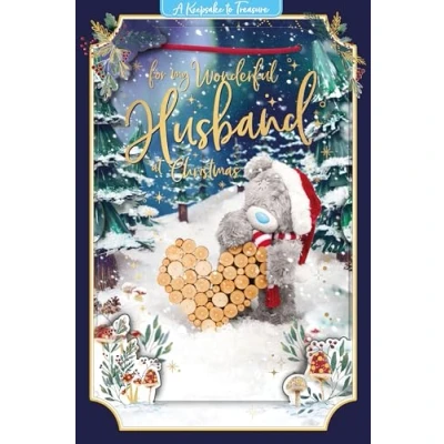 CUTE 3D CHRISTMAS CARD FOR YOUR HUSBAND - this luxury design in the Me to You '3D' range features an adorable lenticular image, bringing Tatty Teddy to life as you gently tilt the card! BESPOKE ME TO YOU ARTWORK - the cute photo-real image shows Tatty Teddy in a starlit snowy forest next to a heart-shaped logpile; the image is repeated on the inside and back of the card, with luxe gold detail to add extra sparkle DETACHABLE KEEPSAKE PLAQUE - the 3D image can be removed to create a cute hanging keepsake plaque that's sure to be treasured long after Christmas Day 6x9 INCHES PREMIUM CARD WITH CHRISTMAS MESSAGE - the loving words on the front of the card read 'For my wonderful husband at Christmas' while the message inside reads 'With all my love today and always' GENUINE ME TO YOU GREETING CARD – unique and instantly recognisable with grey fur, a cute blue nose and patches, Tatty Teddy has captured millions of hearts all over the world with a timeless message of love, happiness and friendship