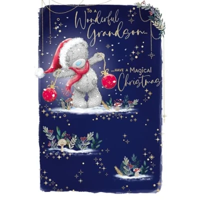 LUXURY CARD FOR GRANDSON - Christmas is the perfect time to let him know how special he is with a fun, festive card featuring loveable Tatty Teddy GOLD FOIL DETAIL - the cute illustrations are enhanced with sparkly gold foil detail to show Tatty Teddy with Christmas baubles in a magical snowy landscape THOUGHTFUL WORDS - the caption on the front of the card reads 'To a wonderful grandson…have a magical Christmas' and the message inside reads 'Wishing you the happiest festive season ever! With love.' PREMIUM CARD MEASURES 6x9ins - made from highest quality materials, with love and care, this gorgeous Christmas card is also illustrated on the inside pages and comes with a matching envelope GENUINE ME TO YOU GREETING CARD – unique and instantly recognisable with grey fur, a cute blue nose and patches, Tatty Teddy has captured millions of hearts all over the world with a timeless message of love, happiness and friendship