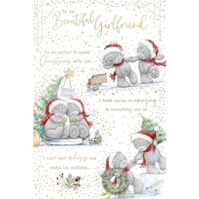 CUTE CHRISTMAS CARD FOR YOUR GIRLFRIEND - let her know just how much you love her with this heartwarming card featuring a unique 'storyboard' front cover and an illustrated paper insert inside ADORABLE TATTY TEDDY ILLUSTRATIONS - the bespoke festive artwork shows two Tatty Teddy bears sharing fun moments as they celebrate Christmas together; open the card to reveal further cute illustrations! ROMANTIC VERSE - the loving verse on the front of the card reads 'To my beautiful girlfriend, I'm so excited to spend Christmas with you...I think you're so amazing in everything you do. I can't wait to kiss you under the mistletoe…' and the inside verse reads '...go stargazing together and make angels in the snow. With all my love' PREMIUM CARD MEASURES 6x9ins - made from highest quality materials, with love and care, this gorgeous Christmas card is sure to be treasured GENUINE ME TO YOU GREETING CARD – unique and instantly recognisable with grey fur, a cute blue nose and patches, Tatty Teddy has captured millions of hearts all over the world with a timeless message of love, happiness and friendship