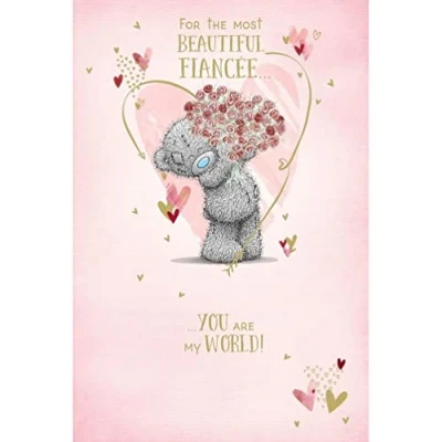 ADORABLE VALENTINE'S CARD FOR A BEAUTIFUL FIANCEE - designed for your special fiancee, this a adorable card features Tatty Teddy holding a large bouquet of red roses inside a golden heart-shaped arrow LUXURY CARD MEASURES 6 X 9 INCHES (15 X 22 CMS) - with gold lettering and beautiful gold foil embellishments, this card is sure to make your fiancee feel loved and appreciated on Valentine's Day ROMANTIC WORDS - the cover message reads: 'For the most beautiful fiancee, you are my world' and the message inside reads: 'With lots of love, hugs and kisses this Valentine's Day' INSIDE COVER ALSO ILLUSTRATED - open the card to reveal another gorgeous hand-sketched illustration of Tatty Teddy holding a giant bunch of red roses PREMIUM ME TO YOU VALENTINE'S DAY CARD - unique and instantly recognisable with grey fur, a cute blue nose and patches, Tatty Teddy has captured millions of hearts all over the world with a timeless message of love, happiness and friendship