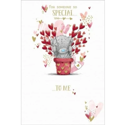 ADORABLE VALENTINE'S CARD FOR SOMEONE SPECIAL - designed for a special person in your life, this adorable card features Tatty Teddy in a plant pot filled with heart-shaped blooms LUXURY CARD MEASURES 6 X 9 INCHES (15 X 22 CMS) - with gold lettering and beautiful gold foil embellishments, this card is sure to make that special someone feel loved and appreciated on Valentine's Day ROMANTIC WORDS - the cover message reads: 'For someone so special to me' and the message inside reads: 'With lots of love this Valentine's Day' INSIDE COVER ALSO ILLUSTRATED - open the card to reveal another gorgeous hand-sketched illustration of Tatty Teddy holding a posy of heart-shaped blooms PREMIUM ME TO YOU VALENTINE'S DAY CARD - unique and instantly recognisable with grey fur, a cute blue nose and patches, Tatty Teddy has captured millions of hearts all over the world with a timeless message of love, happiness and friendship