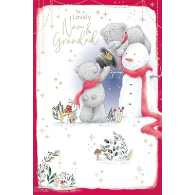 LOVELY CHRISTMAS CARD FOR NAN AND GRANDAD - with its adorable illustration and gold foil detail, this beautiful card is sure to let your nan and grandad know how much they're loved at Christmas and all through the year UNIQUE TATTY TEDDY ILLUSTRATION - the bespoke hand sketched artwork shows two Tatty Teddy bears building a snowman complete with carrot nose and black top hat, with a magical backdrop of twinkly stars and festive foliage LOVING WORDS - The caption on the front of the card reads 'To a lovely Nan and Grandad' and the message inside reads 'Wishing you both the happiest Christmas with lots of love & laughter. Hugs and Kisses' PREMIUM CARD MEASURES 5x8ins - made from highest quality materials, with love and care, your nan and grandad are sure to love this cute Christmas card GENUINE ME TO YOU GREETING CARD – unique and instantly recognisable with grey fur, a cute blue nose and patches, Tatty Teddy has captured millions of hearts all over the world with a timeless message of love, happiness and friendship