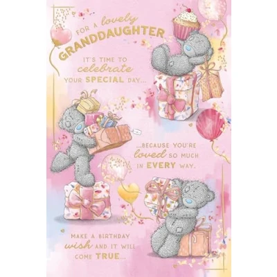 CUTE BIRTHDAY CARD FOR A LOVELY GRANDDAUGHTER - this adorable luxury gold foil card is perfect for sending to a wonderful granddaughter on her special day ORIGINAL ME TO YOU ARTWORK - the stunning hand-sketched illustrations show Tatty Teddy with gift boxes and a cupcake surrounded by colourful balloons and shimmering confetti INSIDE ALSO ILLUSTRATED - open the card to reveal a further gorgeous illustration of Tatty Teddy sitting on gift boxes with balloons LOVING WORDS - the cover message reads: For a lovely granddaughter, it's time to celebrate your special day, because you're loved so much in every way, make a birthday wish and it will come true' and the message inside reads: 'You deserve a birthday that's lovely just like you' PREMIUM ME TO YOU BIRTHDAY CARD - unique and instantly recognisable with grey fur, a cute blue nose and patches, Tatty Teddy has captured millions of hearts around the world with a timeless message of love, happiness and friendship