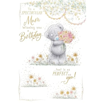 BEAUTIFUL BIRTHDAY CARD FOR MUM - surprise your amazing mum with this luxury card featuring too-cute Tatty Teddy holding a pretty bouquet HANDMADE TOUCHES - The sparkly gems, die-cut front cover and gold foil lettering give a premium feel to this stunning birthday card Bday Mum Bear Holding Flowers AFFECTIONATE WORDS - Cover message: To a spectacular mum, wishing you a birthday…that is as perfect as you! Inside message: Where all your wishes and dreams come true! With love GENUINE ME TO YOU CARD - Unique and instantly recognisable with grey fur, a cute blue nose and patches, Tatty Teddy has captured millions of hearts all over the world with a timeless message of love, happiness and friendship