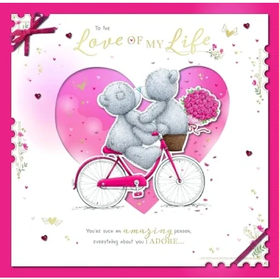 GORGEOUS BOXED VALENTINE'S CARD - luxury design to melt your loved one's heart, with unique artwork featuring two Tatty Teddy bears sharing a romantic bicycle ride together UNIQUE CARD MEASURES 12 X 14 INCHES (30 X 35 CMS) - diecut detail, heart-shaped gems and shiny gold foil lettering combine to create an irresistible card that's perfect for a girlfriend, boyfriend, fiancé, fiancée, husband, wife or anyone who means the world to you! ROMANTIC WORDS - Cover message: To the Love of my Life...You're such an amazing person, everything about you I adore... Inside message: ...I think my love has reached its limit, and then I love you more. You're my favourite person and I cherish the moments we share, I will always be grateful for the way you love and care. We feel complete together and I know deep in my heart, that you're the one I'm meant to be with, I knew it right from the start. You know that I will always be here by your side whatever, supporting and loving you today, tomorrow, forever. With love on Valentine's Day PRESENTED IN A LUXURIOUS GIFT BOX - such a truly special Valentine's card comes in its own box to keep it safe for years to come PREMIUM ME TO YOU VALENTINE'S DAY CARD - unique and instantly recognisable with grey fur, a cute blue nose and patches, Tatty Teddy has captured millions of hearts all over the world with a timeless message of love, happiness and friendship