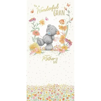 BEAUTIFUL MOTHER'S DAY CARD FOR GRAN - surprise your wonderful grandmother with this adorable card featuring too-cute Tatty Teddy strolling in a magical flower meadow LUXURY GOLD FOIL FINISH - with gold lettering and a beautiful gold foil finish on the butterfly and flower motifs, this Me to You card is sure to add sparkle to a special day THOUGHTFUL WORDS - front cover message 'To a wonderful Gran…Happy Mother's Day' Inside message 'Wishing you a lovely day, with love' CARD MEASURES 4 x 8 INCHES - made from highest quality materials, with love and care, this stunning card is sure to be cherished GENUINE ME TO YOU GREETING CARD – unique and instantly recognisable with grey fur, a cute blue nose and patches, Tatty Teddy has captured millions of hearts all over the world with a timeless message of love, happiness and friendship