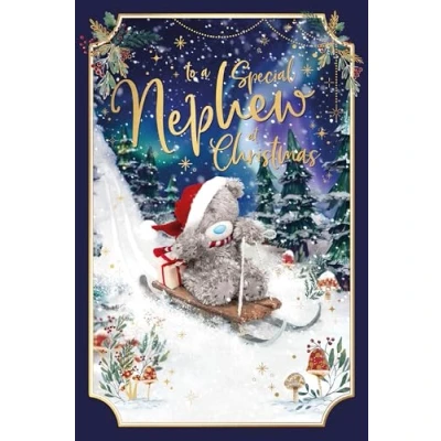 CUTE CHRISTMAS CARD FOR A NEPHEW - this adorable design in the Photo Finish range is sure to make your nephew smile UNIQUE TATTY TEDDY ARTWORK - the photo real image shows Tatty Teddy dressed as Santa sledding down a snowy slope, with a magical golden border of twinkly stars and festive foliage WARM WORDS - the message on the cover reads 'To a special nephew at Christmas' and the words on the illustrated pages inside read 'With love' PREMIUM CARD MEASURES 6x9ins - made from highest quality materials, with love and care, this stunning design is guaranteed to stand out! GENUINE ME TO YOU GREETING CARD – unique and instantly recognisable with grey fur, a cute blue nose and patches, Tatty Teddy has captured millions of hearts all over the world with a timeless message of love, happiness and friendship
