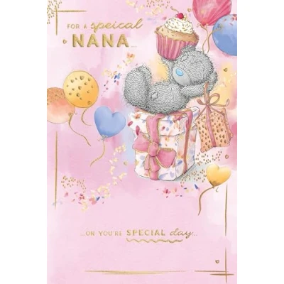 CUTE BIRTHDAY CARD FOR A SPECIAL NANA - this adorable luxury gold foil card is perfect for sending to a wonderful nana on her special day ORIGINAL ME TO YOU ARTWORK - the stunning hand-sketched illustrations show Tatty Teddy holding a cupcake and balancing on a colourful gift box surrounded by balloons and shimmering confetti INSIDE PAGES ALSO ILLUSTRATED - open the card to reveal a further gorgeous illustration of Tatty Teddy with gift boxes AFFECTIONATE WORDS - the cover message reads: 'For a special nana on your birthday' and the message inside reads: 'Sending love your way' PREMIUM ME TO YOU BIRTHDAY CARD - unique and instantly recognisable with grey fur, a cute blue nose and patches, Tatty Teddy has captured millions of hearts around the world with a timeless message of love, happiness and friendship