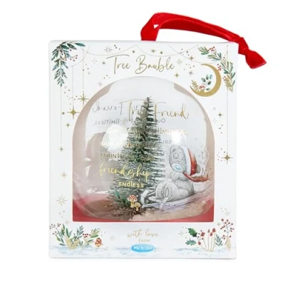 QUALITY GLASS BAUBLE FOR A TRUE FRIEND - your amazing friend will be thrilled to receive this cute Christmas bauble with its gorgeous Tatty Teddy illustration and heartfelt caption which reads 'True friend...our laughs limitless, our memories countless, our friendship endless' THOUGHTFUL GIFT AT CHRISTMAS - celebrate the joys of true friendship by treating your friend to this lovely tree decoration; it comes complete with a red satin hanging ribbon for display on a tree branch - the flat resin bottom means it can also be placed on a level surface such as a windowsill or mantelpiece PRESENTED IN LUXURY GIFT BOX - the Signature Collection gift packaging is illustrated with seasonal foliage and embellished with luxury gold foil detail QUALITY CHRISTMAS GIFT - designed in the UK and crafted with love and care from premium materials, Me to You gifts add a touch of festive fun at this magical time of the year GENUINE TATTY TEDDY by ME TO YOU – unique and instantly recognisable with grey fur, a cute blue nose and patches, Tatty Teddy has captured millions of hearts all over the world with a timeless message of love, happiness and friendship