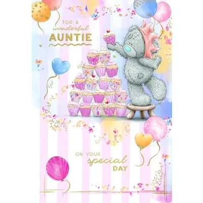 CUTE BIRTHDAY CARD FOR A LOVELY AUNTIE - this adorable luxury gold foil card is perfect for sending to a wonderful auntie on her special day ORIGINAL ME TO YOU ARTWORK - the stunning hand-sketched illustrations show Tatty Teddy stacking cupcakes surrounded by colourful balloons and shimmering confetti INSIDE ALSO ILLUSTRATED - open the card to reveal a further gorgeous illustration of Tatty Teddy placing cupcakes into a box AFFECTIONATE WORDS - the cover message reads: 'For a wonderful auntie on your special day' and the message inside reads: 'With love, happy birthday' PREMIUM ME TO YOU BIRTHDAY CARD - unique and instantly recognisable with grey fur, a cute blue nose and patches, Tatty Teddy has captured millions of hearts around the world with a timeless message of love, happiness and friendship