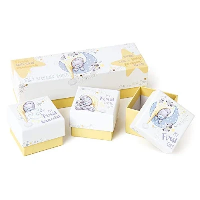 BOXES FOR BABY BRACELET, FIRST TOOTH AND FIRST CURL - the perfect way to keep safe and sound the hospital name band of your baby, and later on their first little lock of hair and their very first tooth HAND DRAWN TATTY TEDDY ILLUSTRATIONS - each pale yellow box has its own picture of Tatty Teddy sleeping soundly on a cloud, on the moon or cuddling a favourite toy lamb LARGE KEEPSAKE STORAGE BOX - the miniature baby keepsake boxes fit neatly into a larger one with a lid that features a dozing Tatty Teddy counting sheep and the words 'Three boxes full of treasure, and 'Precious things to keep forever and ever' PERFECT GIFT FOR A BABY SHOWER OR NEW PARENTS - with its gender-neutral design and timeless illustrations, this baby gift is a charming way to celebrate the news that a new mum is expecting or to welcome a new baby into the world GENUINE TATTY TEDDY by ME TO YOU – unique and instantly recognisable with grey fur, a cute blue nose and patches, Tatty Teddy has captured millions of hearts all over the world with a timeless message of love, happiness and friendship