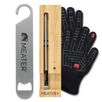 Complete Wireless Freedom: 100% wire-free with a built-in Bluetooth repeater in the charger, MEATER Plus gives you up to 165ft of wireless range. Monitor your cook from virtually anywhere in your home—just 5 minutes of charging gives you 2 hours of cooking time. Precision You Can Count On: Dual sensors track both internal meat temperature (up to 212°F) and ambient temperature (up to 527°F), delivering precise, consistent results whether you’re grilling, smoking, roasting, or baking. Your Smart Grilling Sidekick: The free MEATER app’s Guided Cook System provides step-by-step instructions, real-time alerts, and estimated finish times, so you can cook with confidence and eliminate guesswork—whether you're a beginner or a seasoned grill master. Designed for the Heat of the Moment: This exclusive bundle includes the MEATER Plus, a pair of heat-resistant black BBQ mitts, and a MEATER bar blade opener. Stay safe around the grill, handle hot trays with confidence, and enjoy a cold drink when the cook is done—it’s the ultimate cookout upgrade. Gift-Ready for Grill Lovers: Perfect for BBQ enthusiasts, dads, home chefs, or anyone who loves to cook with precision. This bundle makes a standout gift for birthdays, holidays, housewarmings, and weddings—because great meals (and cold drinks) are always worth celebrating.