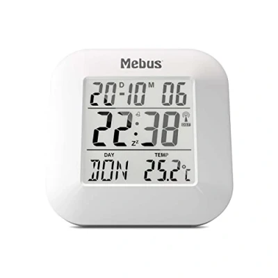 Mebus Digital Wireless Alarm Clock with Thermometer, Date and Lighting, Snooze Function, Plastic, White, 8 x 8.5 1.8 cm