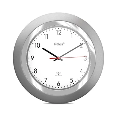 Mebus Radio Controlled Wall Clock, Classic Model, Silver Frame, White Dial, 24 cm Diameter, Round, Clock (DCF77), Model: 19452, Colour: Silver,
