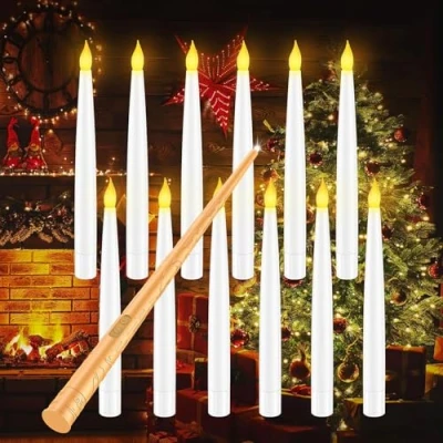 Flameless candles with wand remote control: You will receive these 12 Flameless Floating Candles, equipped with a magical and fun wand remote control (13 inches) that can magically turn on and off these flickering flameless hanging candles simultaneously. The magic wand remote control only requires one AAA battery to power up (not included). When away from these battery candles, the wand can turn them on/off with one click, which is both convenient and fun. Floating Candles for Holiday Decoration: This set of flameless candles comes with a 4.9 foot fishing line (almost invisible) that is pre connected to these LED cone shaped candles that are ready to be hung. You can use thumbnails to insert these hanging candles into the ceiling, or use hooks to fix these electric candles to windows, walls, or Christmas trees, or use creativity to find your own unique display, This is the perfect decoration for holidays, church, fireplaces, homes, and outdoors. Flickering Warm Light LED Taper Candles,: These battery operated candles emit warm flickering light which can provides warm atmosphere to improve visibility and ambience. 3D realistic flicker design feels and looks like a real taper candle flame flickering. There is absolutely no fire or burning danger and these electric candles are safe for families with pets or young child, you will have perfect ambient evenings with peace of mind. Decorative Electric Candles: Compared to other traditional flameless candles, each battery flameless candle requires 1 AAA battery (not included) and can work continuously for 200 hours. These electric candles are more environmentally friendly and a better choice for saving nature. These hanging candles have a size of approximately 6.65 x 0.63 inches and can be widely used. Magical Birthday Gifts for Kids: These flameless candles with magic wand remote are packed in a high-grade gift package It's a fun way for children to use their imagination and practice their wand skills. The hangging candles with a magic wand remote will bring a feel of the magical world! Package Set : You will receive 12 pack 6.65 inch tall and 0.63 inch diameter LED candles with pre-attached fishing line , 1 magical wand remote, hooks and pushpins.
