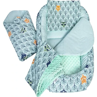 Medi Partners 5pcs Set with Baby Nest 100x60x15cm Removable Insert Flat Cushion Blanket Babyhorn for Babies Newborns 100% Cotton (Forest mint Plush)