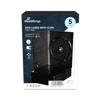 For Space Saving and organised storage your media collection With transparent sheet to insert the cover Colour: Black Size: 191 x 136 x 14 mm Contents: 5 empty cases for 1 disc with DVD