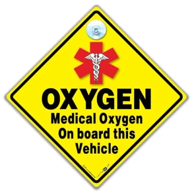 MEDICAL ALERT: High-visibility yellow warning sign with medical cross symbol to indicate medical oxygen transport in vehicle DIMENSIONS: Measures 14 cm x 14 cm, offering optimal visibility without obstructing driver's view SECURE MOUNTING: Includes 20 mm premium reusable suction cup for reliable attachment to vehicle windows DURABLE DESIGN: Weather-resistant construction with non-fade properties ensures long-lasting visibility and effectiveness CLEAR MESSAGE: Bold black text on yellow background clearly communicates presence of medical oxygen to other road users