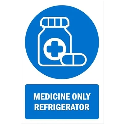 Medicine only refrigerator, safety sign. Self adhesive sticker. Printed using the latest digital technology and laminated for extra durability. Remove backing film and apply to dry, smooth, oil free surface. All signs come with a 5-year warranty.