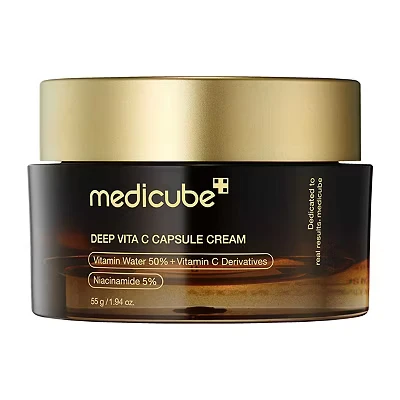 Medicube Deep Vita C Capsule Cream 55g is a lightweight, vitamin C-infused moisturizer featuring burstable capsules for maximum potency to brighten dull skin, fade dark spots, and boost radiance. Its gentle, stable formula hydrates without irritation, making it suitable for sensitive skin and daily use.