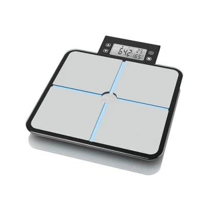Detailed body composition: accurately measures weight, body fat, body water, muscle mass and bone mass, integrated calorie requirement analysis (BMR) Innovative removable display: detachable display unit with stand and wall mount, blue illumination activates automatically when in use Convenient memory: stores up to 10 personal measurements, for smart monitoring in health changes as weight and body composition over time Robust and elegant design: tread area made from 6 mm safety glass with rounded corners, sensor-touch buttons ensure comfortable and easy operation Energy-saving: features automatic "step-on" activation, energy-efficient automatic switch-off after 10 seconds