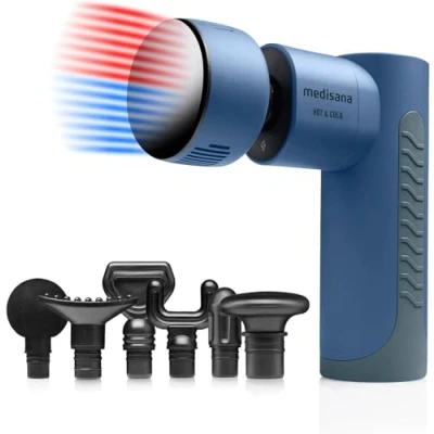 Medisana MG 600 massage Gun with Hot & Cold function, deep tissue 3 vibration levels, ergonomic shape design and accent color "stone blue", 7 attachments, battery operation